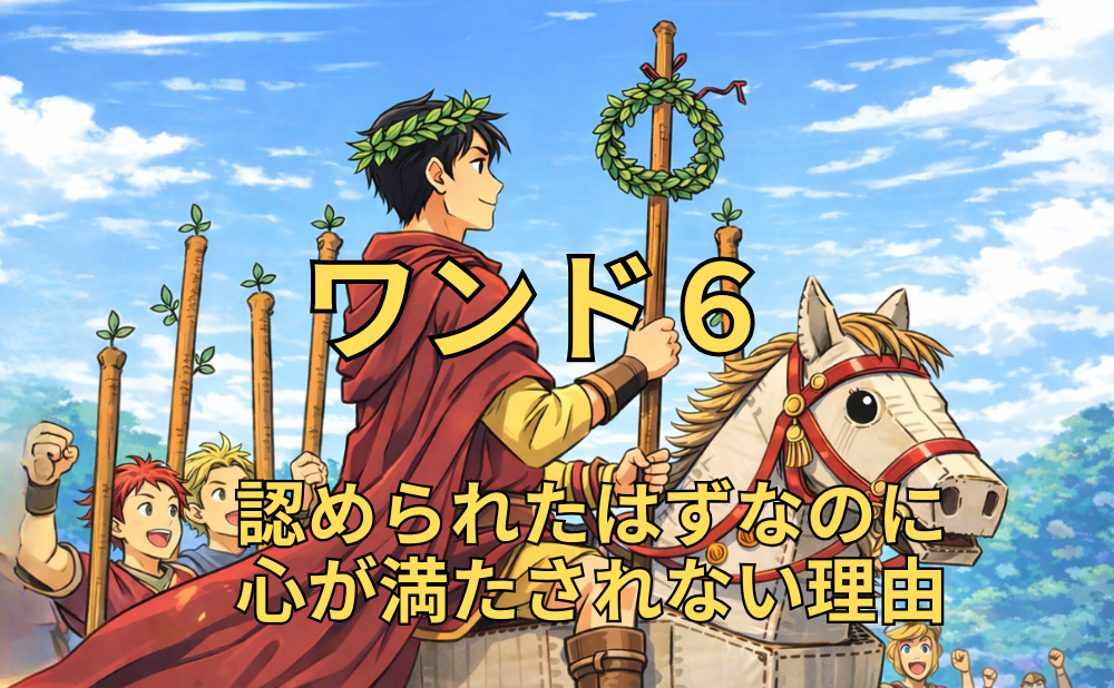 逆位置のワンド6は、結果が出ていないというより、心が納得できていない状態を示します。外の評価と内側の感覚のズレに注目すると、メッセージが読み取りやすくなります。