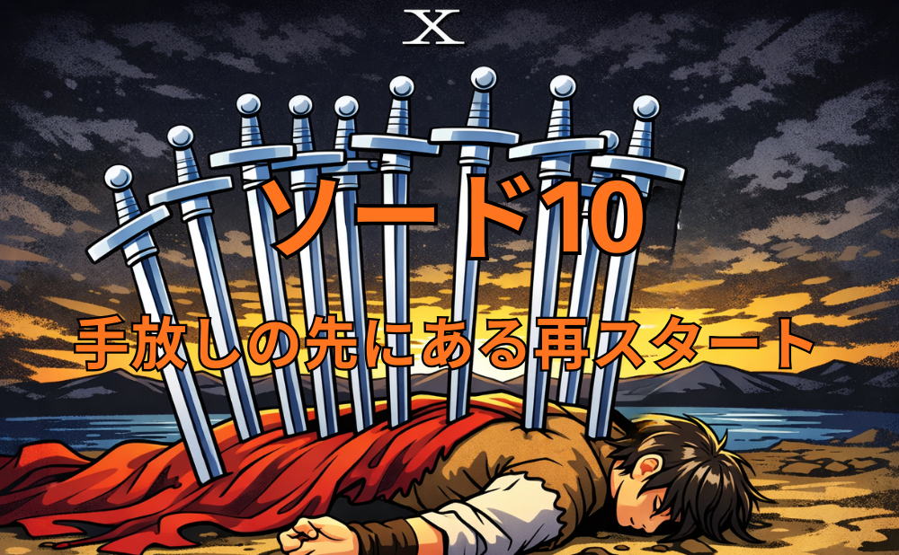 ソード10は「もう限界」と感じる場面を映しつつ、同時に流れが切り替わる合図でもあります。絵柄やキーワードを手がかりに、正位置・逆位置、相手の気持ちまで整理すると、今の状況が読み解きやすくなります。ここから要点をまとめます。