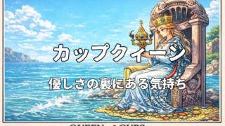 タロットのカップクィーンを、キーワード・絵柄・本音・相手の気持ち・テーマ・メッセージまで詳しく解説。正位置と逆位置の違いをやさしく整理し、気持ちの読み方が自然とつかめる内容です。
